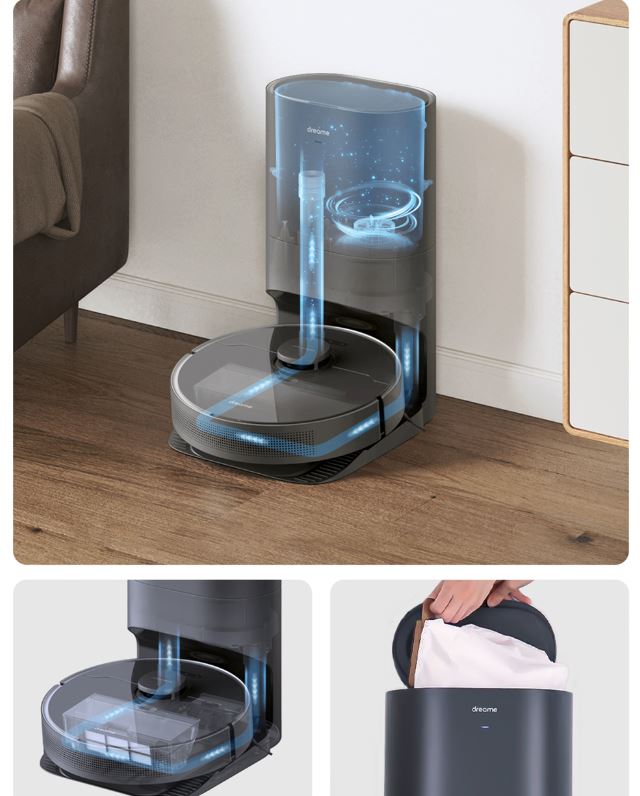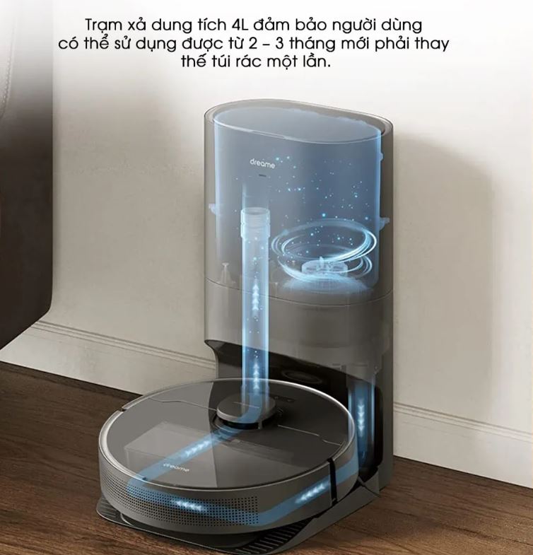 - Trạm xả bụi tự động dung tích 4L: dock sạc được tích hợp trạm xả bụi tự động dung tích 4L cho khả năng lưu trữ lên đến 2 tháng người dùng mới cần phải thay túi rác một lần.