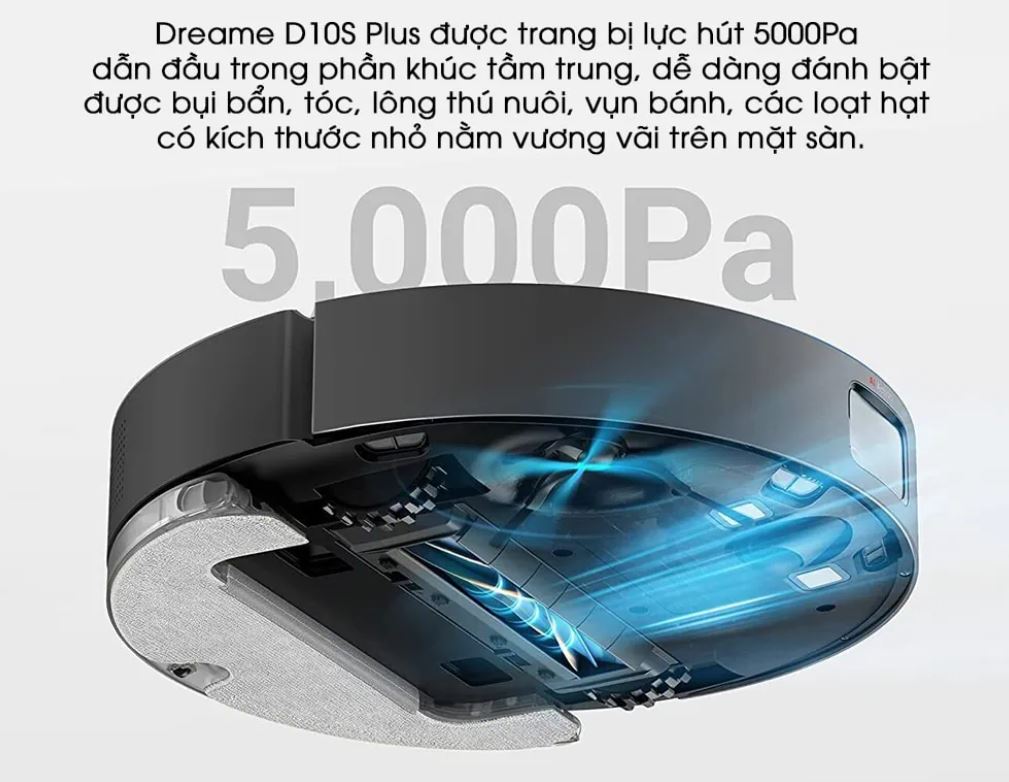 Robot hút bụi Dreame D10S Plus được trang bị lực hút 5000Pa dẫn đầu trong phần khúc tầm trung, dễ dàng đánh bật được bụi bẩn, tóc, lông thú nuôi, vụn bánh, các loạt hạt có kích thước nhỏ nằm vương vãi trên mặt sàn. Ngoài ra lực hút lớn còn giúp thiết bị làm việc hiệu quả trên mọi loại chất liệu, loại bỏ bụi mịn ẩn sâu trong các khe, kẻ, điểm giao nhau giữa gạch nền, gỗ lát, tốt ưu khi vệ sinh trên thảm.